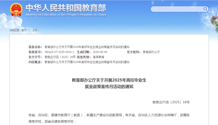 【环球网报道 记者 陈全】记者从教育部获悉,日前,教育部印发《关于开展2025年高校毕业生就业创业政策宣传月活动的通知》(以下简称《通知》),部署6月-7月在全国范围内开展2025年高校毕业生就业政策宣传月活动,深入贯彻落实党中央、国务院“稳就业”决策部署,帮助用人单位和毕业生充分知晓并用好就业优惠政策,促进高校毕业生高质量充分就业。